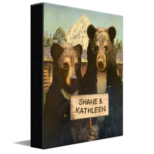 This fun adaptation of the classic 20th-century painting, American Gothic, features two black bears and your personalization on the sign. It makes a great customized gift for any special occasion and fun rustic décor for your home or cabin.