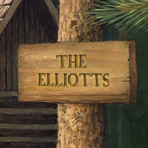 This detailed image is published from a watercolor painting. It captures the warm glow from the cabin windows, two Adirondack chairs on the lake shore and a pair of Labrador Retrievers in the front yard. To make it extra special, this unique personalized gift features your customization on the welcome sign hanging outside of the cabin.