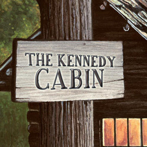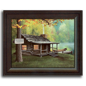 "Welcome Home" is a unique personalized gift that features your personalization on the welcome sign hanging outside of the cabin. It is published on fine art paper and finished Framed Under Acrylic in a contoured frame with a brown wood-grain