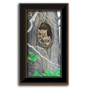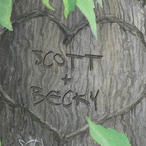 Screech Owls mate for life and typically nest in the hollow of a tree. When they "court" the male flies near a female, bobs and swivels his head, then slowly winks one eye at her. When she finally accepts him they move close together and touch bills. In this unique personalized art print, these romantic owls are nestled together in the hollow of a tree that is personalized with the names of your choice ,carved, into the heart.