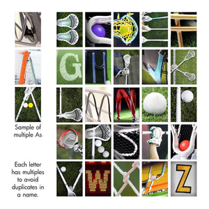 Create your custom lacrosse name art with three to eleven characters to spell out any first name, last name, or any other words! Preview your personalized name art by typing in your name and hitting the “Preview” button. To try out different images, simply click on a letter to swap it out with a different lacrosse-related image. The stadium photo makes a beautiful backdrop for the letters and a unique personalized lacrosse gift! Create yours today!