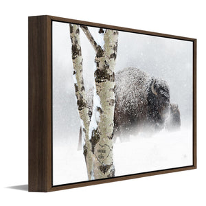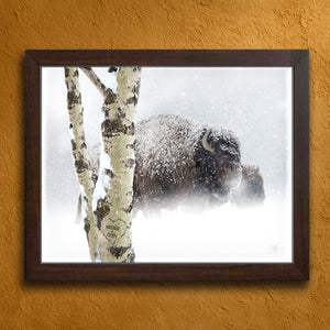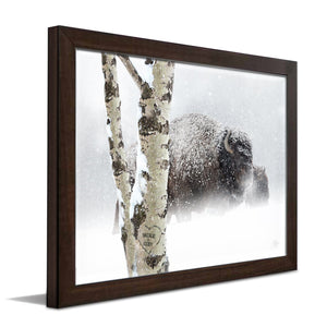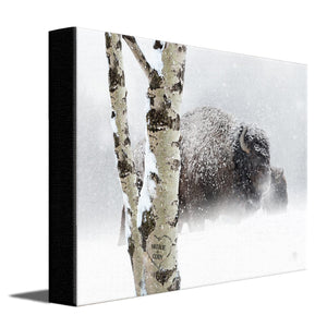 This dramatic artwork depicts American Bison in the snow and features the two names of your choice carved into the heart on the Aspen tree.