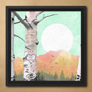 "Aspen Mountain" is individually personalized with the two names of your choice carved in the heart. This simply beautiful print features a beautiful Nordic inspired landscape. The art portrays a beautiful scene with the sun setting over a mountain and Aspen trees.
