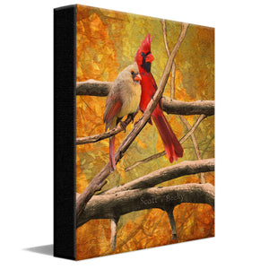 - A male and female Cardinal and the golden leaves in the Fall create a picturesque scene.
