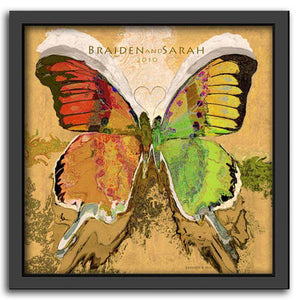 At first glance, this piece appears to be one butterfly, but on closer examination of the nature canvas art, one sees that there are really two. This beautiful and decorative personalized art print celebrates the joining of two hearts together in life to become one. Each custom canvas wall art print is individually personalized with two names and even a special date.