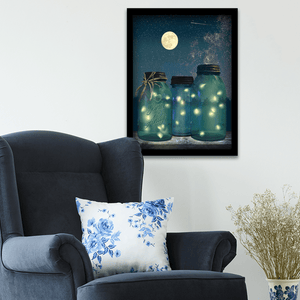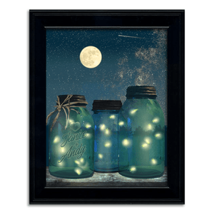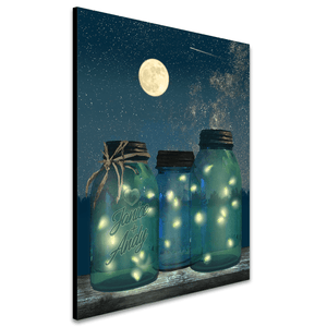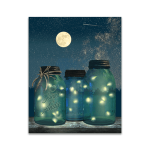 The fireflies dance in the moonlight and illuminate the glass jars in this romantic print. Simply enter your personalization options above and let our artists do the rest. Made in the USA with the highest quality standards. It makes a romantic gift for any special occasion.