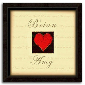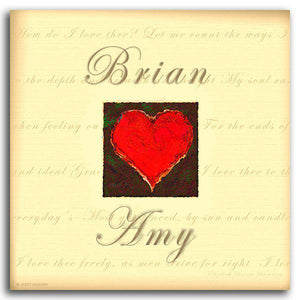 This personalized art print is done in an elegant and simple style but is rich in depth and beauty. Each piece is personalized with your names and the famous poem by Elizabeth Barrett Browning appears subtly in the background. "How do I love thee? Let me count the ways. I love thee to the depth and breadth and height..."