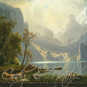 Albert Bierstadt (1830 – 1902) was a German American Painter best known for his lavish, sweeping landscapes of the American West. His masterpiece, "Lake Tahoe", is a beautiful scene that can be personalized for you with the names of your choice above the romantic quote: "My love for you is a journey; starting at forever and ending at never".