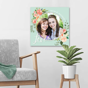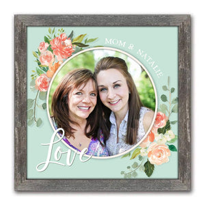 Use the input boxes below to customize your photo to art print. It has a watercolor floral background, the word "Love" is written in a beautiful script and your personalized text appears wrapped around the circle in the upper right. Upload your photo (larger images are better) and see a live preview of your design.