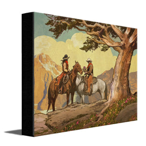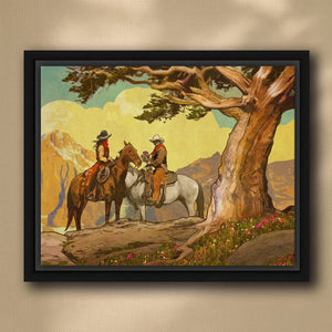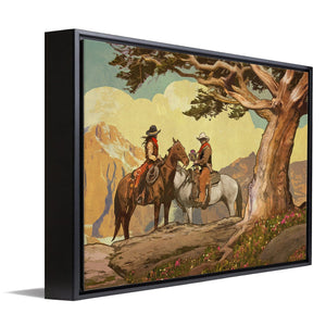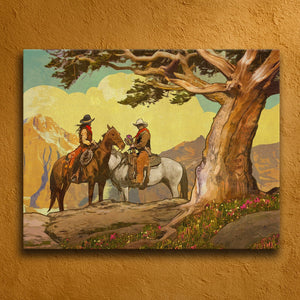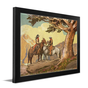 This stunning Western art painting illustrates the heart of the cowboy... from the Rocky Mountains in the distance, the cowboy and cowgirl couple, to the heart they have carved on the tree in the foreground.