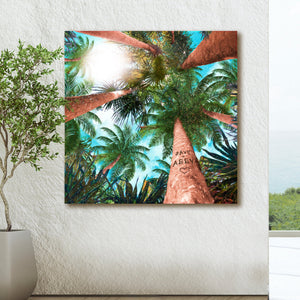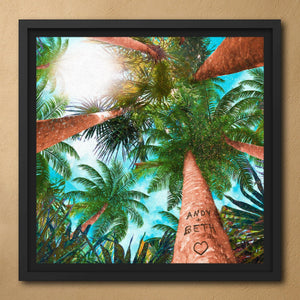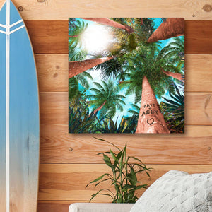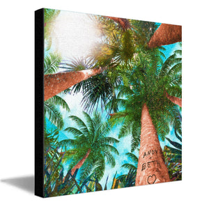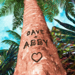 "Palm Tree Sky" is individually personalized with the two names of your choice carved on the tree above the little heart. This art print is a fun perspective looking up through the Palm trees silhouetted against the blue sky.