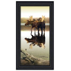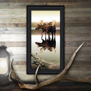 Serene and beautiful wildlife art features a pair of Alaskan Moose at a peaceful northern lake...
