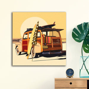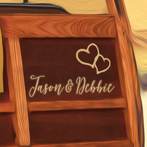 From the classic Woody wagon, surfboards on the roof rack, a license plate that says BeachLvrs and your personalized names on the back of the car... this nostalgic print has it all!