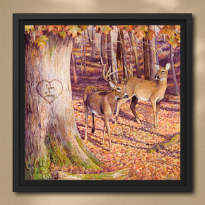 This beautiful, personalized art canvas features two Whitetail Deer, the warm colors of Autumn and the names of your choice, personalized inside the heart on the tree. Warm up your home and add beautiful art with this nature wall decor. Animal art prints can be hung in any room in your home, cottage, or cabin.