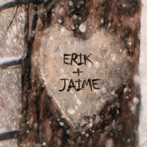 This classic Winter woods scene features two moose and your personalized names "carved" into the heart on the tree.