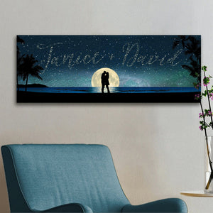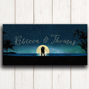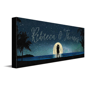 When your love is bigger than the night sky, your names are written in the stars. This romantic gift features a beautiful night sky, the silhouette of two lovers kissing in the moonlight beach and your names in the art.
