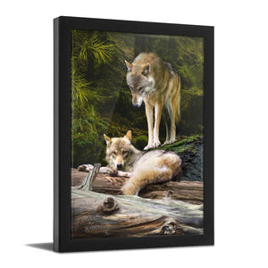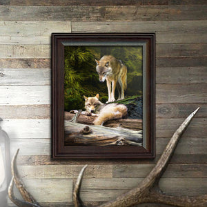 This stunning personal print by wildlife artist Scott Kennedy features two beautiful gray wolves and your name(s) personalized as part of the print. Your names will be made as a part of the artwork, ,carved, into the log in the lower left corner of the image.
