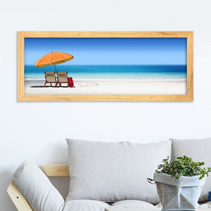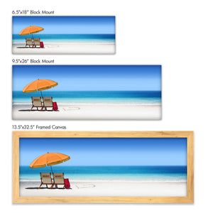 - Bright blues, cool waves, and a pop of orange makes this a great framed beach picture to brighten up your home.