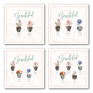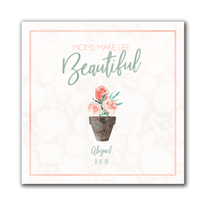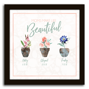 Personalized with the names, birthdates and the birth month flowers, for moms with one, two, three, four or five kids. The quote on this print reads: "Moms Make Life Beautiful" and each print is custom made for you.