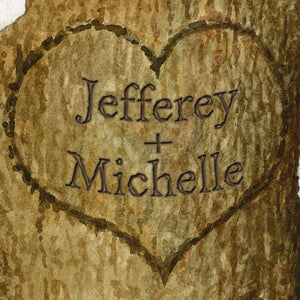 - On the tree trunk is a heart etched into the bark where your names or initials are individually personalized in the nature wall decor.