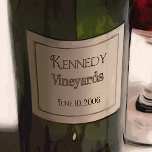 Commemorate and celebrate your love for each other and – yes – wine, with our personalized art print “Drinks for Two.” Each romantic print is handcrafted with your personalized wine label... include your name(s), a date, a vintage, or a favorite vineyard! This makes each piece a one-of-a-kind work of wine canvas art! If you look closely at the beautiful details, you,ll notice one of the glasses has a kiss of lipstick.