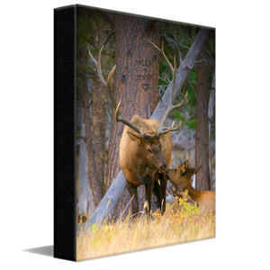 This romantic photography print shows an elk couple touching noses. It is published on fine art paper and is finished Framed Under Acrylic in a contoured frame with a brown wood-grain