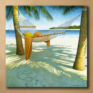 Island Dreams is an individually personalized art design with your names or initials inside the heart on the sandy ocean beach. It is a truly romantic personalized gift for the one you love. This beach scene allows you to take a dip in the ocean to cool off and take a nap in a relaxing hammock in the shade.