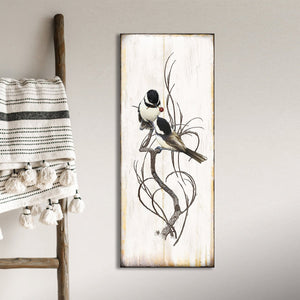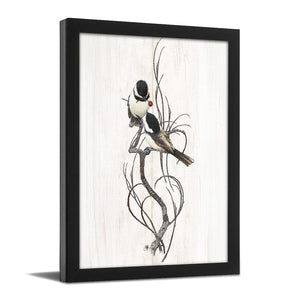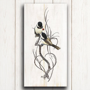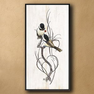 Beautifully designed by internationally collected artist Scott Kennedy, this Chickadee artwork conveys romance on several levels. The branches that the chickadees are perched on form a natural heart toward the bottom of the print. Additionally, each nature wall decor print is personalized with the names of your choice subtly "carved" on a tree branch. All of these elements together make for a truly romantic personalized gift.