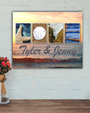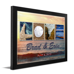 A beach ocean sunset creates the romantic mood in the background and highlights the letter photography that includes a starfish, sand dollar and ocean waves to spell "LOVE". Shop Personal-Prints for all your art desires, coastal wall art, beach décor, personalized ocean gifts, personalized romantic gifts and more...