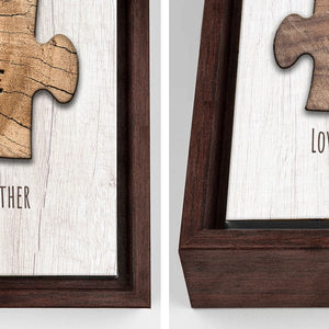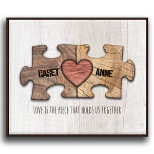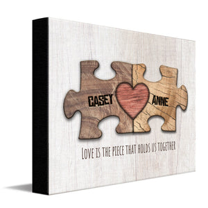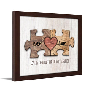This special personalized gift features two names etched into the puzzle pieces connected by a heart shaped piece. The quote below reads, "Love is the Piece That Holds Us Together".