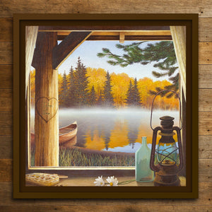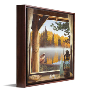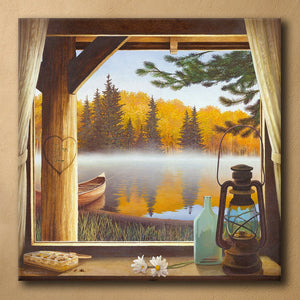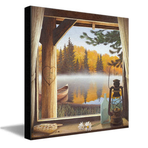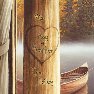 Gaze out of the window to a picturesque mountain lake getaway and disappear into this beautiful and quiet scene. The close-up detail of the lantern on the windowsill contrasted against the canoe on the lake and the pine trees in the background add a natural depth. On the post in this cabin decor print is a romantic heart where your personalized names are carved, and you can even add additional names for your children or grandchildren.