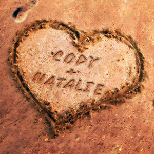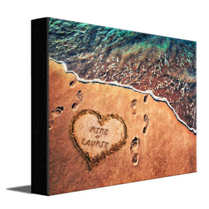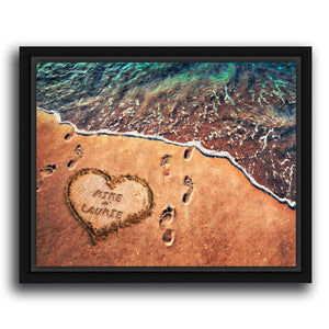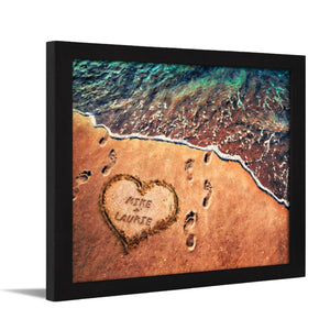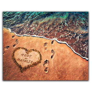 Take a romantic walk on the beach where your names are drawn in the heart in the sand. The names are created as a permanent part of the image and will not look like a stamp or afterthought as it is uniquely adjusted by our designers for perfect alignment. Since each personalization has an artist,s touch, a preview of your customization is not available.