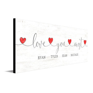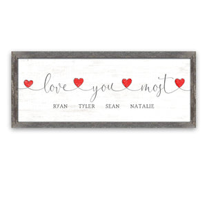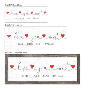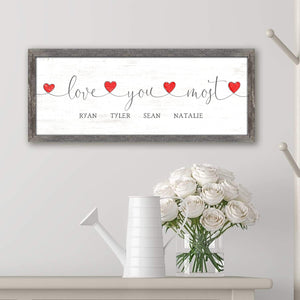 The text "Love You Most" is tied together with hearts and includes your personalization below. Simply enter your customization options and let our artists do the rest. Your print is made in the USA, special for you, and it ships fast.