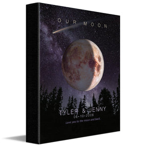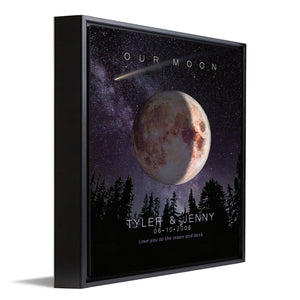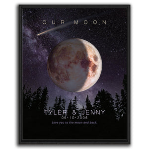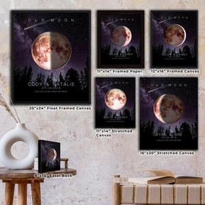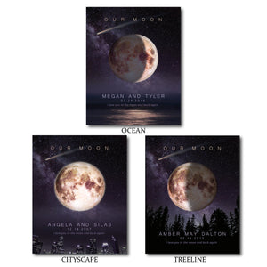 In addition to being personalized with your names and the choice of skyline (ocean, city, or trees), this beautiful print shows the exact phase of the moon that corresponds with the special date you choose!