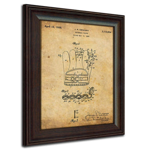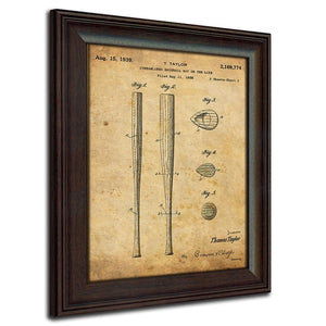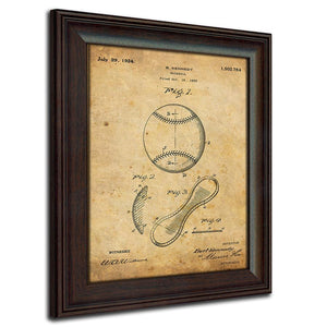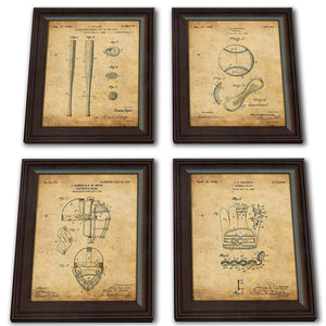Based on the actual and original USA patents (early 1900,s) of a baseball bat, baseball, baseball glove, and catcher,s mask. Artistically set on a vintage paper background, each print is published in our USA studio and finished behind glass in a 14"x17" contoured frame with a brown wood grain