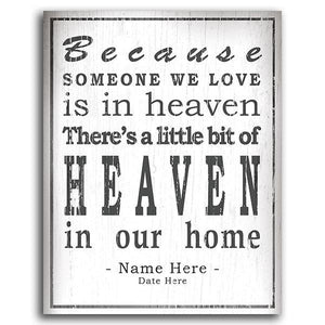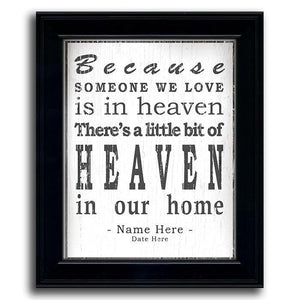 Remember and honor your loved ones with a special personalized print that incorporates their name and even a date as a part of the art. Featuring the quote: "Because someone we love is in heaven, there,s a little bit of heaven in our home".