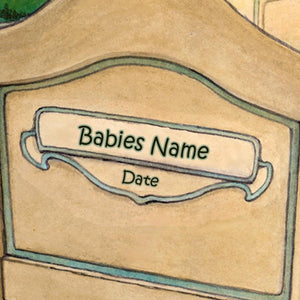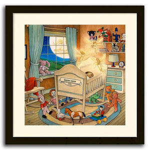 In this heartwarming print, the nursery is alive in a fairy-tale celebration of new life! The crib can be individually personalized with the child,s name and you can even include a birth date as a part of the artwork... a great personalized gift for the new baby!