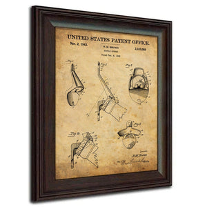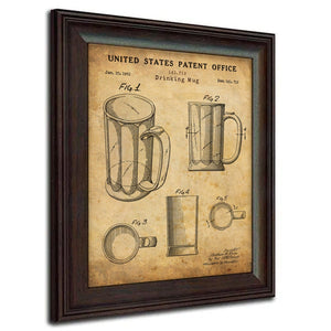 Based on the actual and original patents for a bottle opener (1942) and classic beer mug (1951). This set of two prints are artistically set on a vintage paper background. Each print is published in our USA studio and finished behind glass in a 14"x17" contoured frame with a brown wood grain