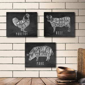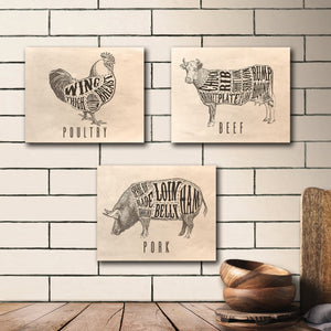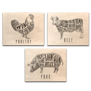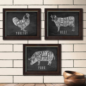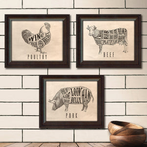 Set of three butcher cut prints include Beef, Pork and Poultry. Available in several size / display options.
