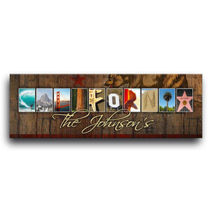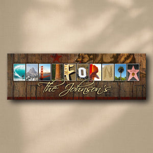 This creative and beautiful California wall art print features themed photography from the beautiful west coast state which spells out the state name! Below the photos you can add your family name or word of your choice to the personalized art! Simply enter your desired personalization in the input box below and let our artists do the rest. From waves to the Golden Gate Bridge to a close-up of the Hollywood sign that makes the O of California, you can have the best of the state with this state art.
