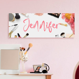 - This décor features various cosmetics, makeup, and beauty supplies on a white background, with your chosen name or text written in pink lipstick.