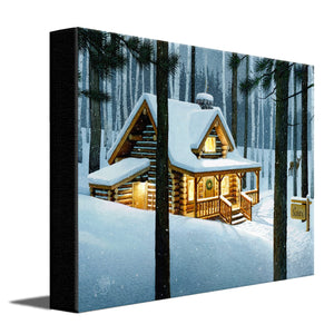- This winter scene captures the warm welcome of a cabin in the woods.