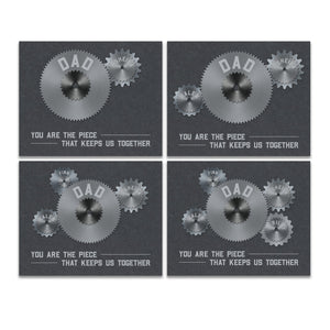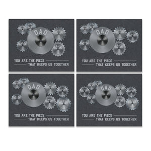 The center piece says "DAD" and each of the connecting gears is personalized for you. Simply enter your personalization options above and let our artists do the rest. Personalize with one to eight additional gears.