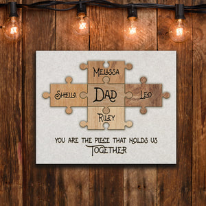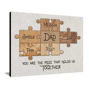 This special personalized gift for dad features the names of his kids etched into the puzzle pieces. The quote below reads, "You are the piece that holds us together".