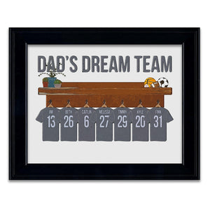 Personalized with the names and numbers of up to seven jerseys in this fun personalized gift for Father,s Day. Makes a great gift for the sports fan Dad with his kids names as a part of the art.