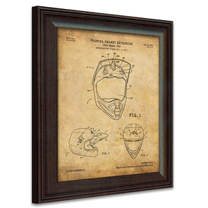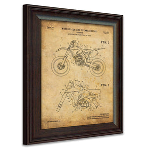 Based on the actual and original patents for a Yamaha dirt bike intake device (2009) and dirt bike helmet extension (2011). This set of two prints are artistically set on a vintage paper background. Each print is published in our USA studio and finished behind glass in a 14"x17" contoured frame with a brown wood grain