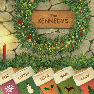 "Family Christmas" can be ordered with 2, 3, 4, 5, 6 or 7 individually personalized stockings and in addition, your family name is personalized inside the wreath. Simply enter your personalizations in the input boxes below and separate the stocking names with a comma. Stockings will be personalized in order from left to right.