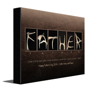 This heartfelt print spells "father" in a rustic antler letter theme and includes the quote: "One of the best gifts I ever received came from God. I call him ,Dad.,"
