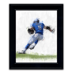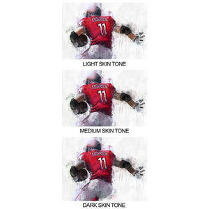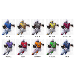 Personalized art for the football player that features your name on the jersey as well as selection of skin tone, the jersey number, and jersey color of your choice. Simply enter your customization options in the input boxes and let our artists do the rest... ships ready to hang and enjoy!