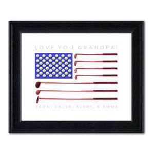 This patriotic US flag is made from Golf clubs as the stripes and Golf balls as the stars and is customized for you! Personalize the top and bottom lines with the text, name, or message of your choice as a part of the artwork. Your order will be hand crafted in the USA and shipped fast to you!